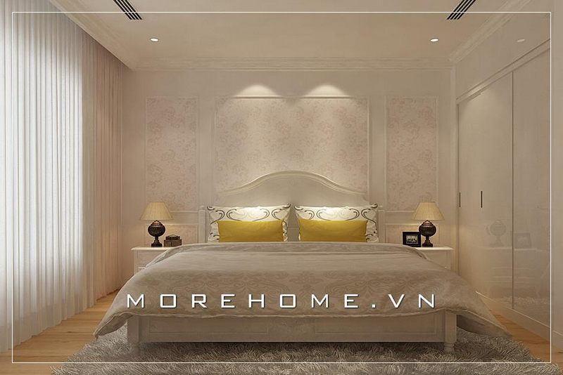 Thiết kế giường ngủ 2 người sang trọng, tinh tế với gam màu trắng chủ đạo