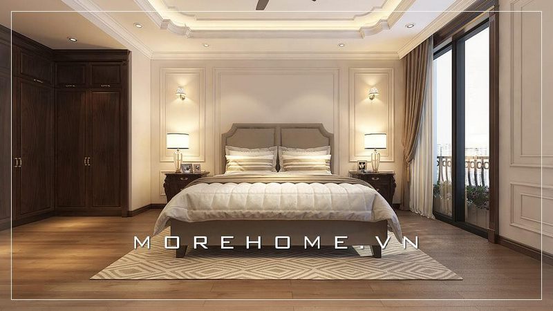 Thiết kế giường ngủ Master tại chung cư cao cấp phong cách tân cổ điển, từng đường nét chạm khắc nhẹ nhàng tạo ấn tượng cho cả không gian nghỉ ngơi của gia chủ