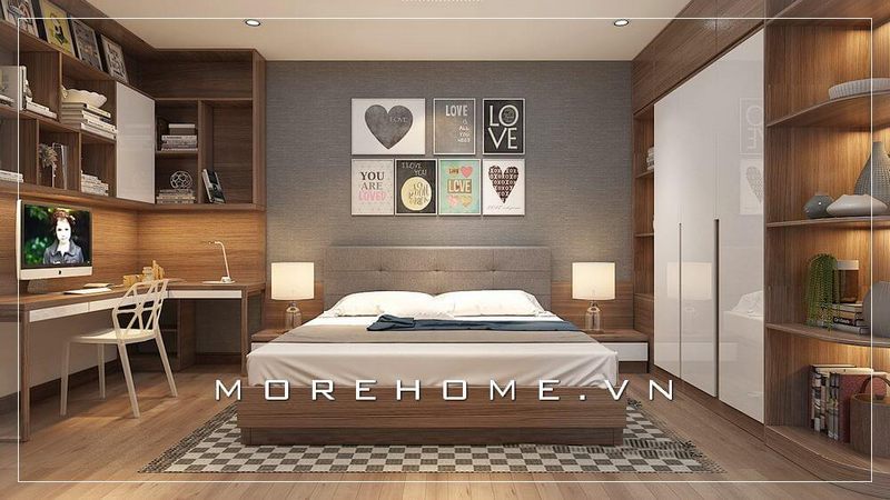 Giường ngủ chung cư với thiết kế hiện đại, đơn giản, tone màu nâu trầm ấm tạo cảm giác thoải mái và thư giãn hơn cho không gian phòng ngủ nhỏ