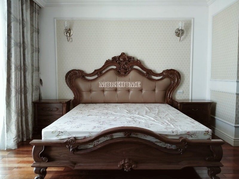 Giường ngủ gỗ óc chó cao cấp được thiết kế theo phong cách tân cổ điển đầy sang trọng, từng đường nét chạm khắc tỉ mỉ, tinh tế mang lại cảm giác cuốn hút, thoải mái, phù hợp với sở thích của gia chủ