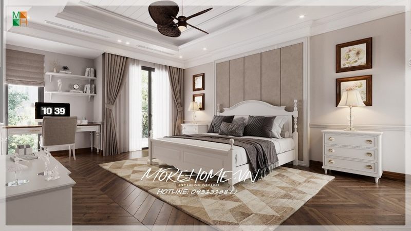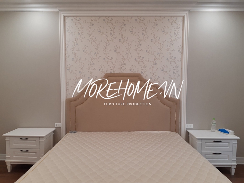 Hình ảnh công trình thi công thực tế giường ngủ gỗ tự nhiên tân cổ điển phun sơn màu trắng đẹp do Morehome thực hiện