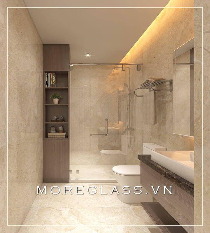 Vách tắm kính 180 độ phân chia 2 khu vực phòng tắm đứng và nhà vệ sinh đem tới sự riêng biệt tránh văng nước gây ướt át khó chịu không thoải mái khi sử dụng cho gia chủ.