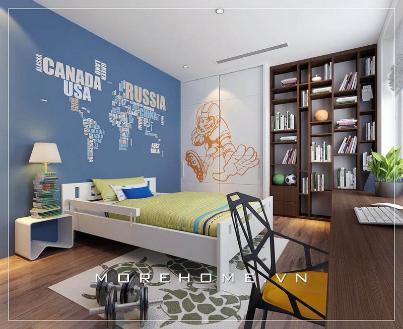 Thiết kế phòng ngủ cho bé hiện đại với mẫu giấy dán tường màu xanh có họa tiết bản đồ tạo nên nét ấn tượng, khoa học và linh hoạt cho trí tưởng tượng cho phòng ngủ của bé trai