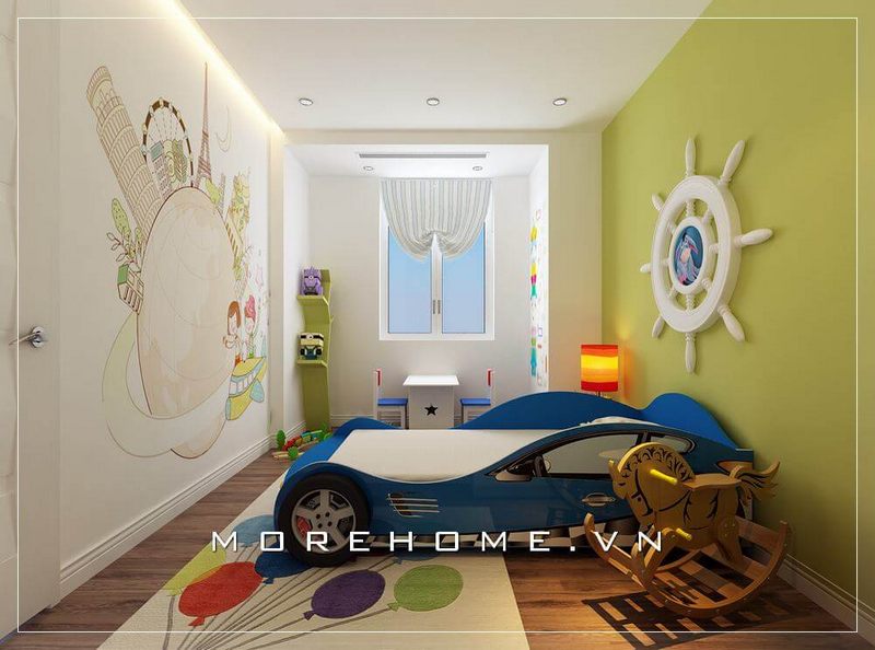 Gợi ý phòng ngủ bé trai đầy ấn tượng, chiếc giường ngủ kiểu dáng ô tô màu xanh đầy cá tính tạo nên sự thích thú cho trẻ nhỏ