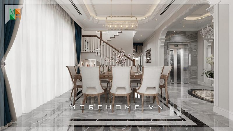 Thiết kế phòng ăn cao cấp sang trọng với sắc trắng tinh khôi thống nhất cùng phong cách tân cổ điển đầy ấn tượng
