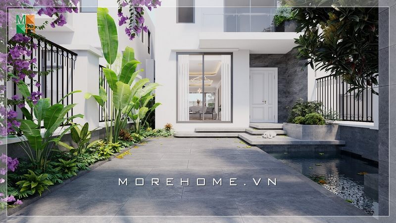 Thiết kế kiến trúc ngoại thất biệt thự cao cấp, sang trọng, với cây xanh và hồ cá trước cửa nhà, với ý nghĩa phong thủy mong muốn mang đến tài lộc, vượng khí cho gia đình