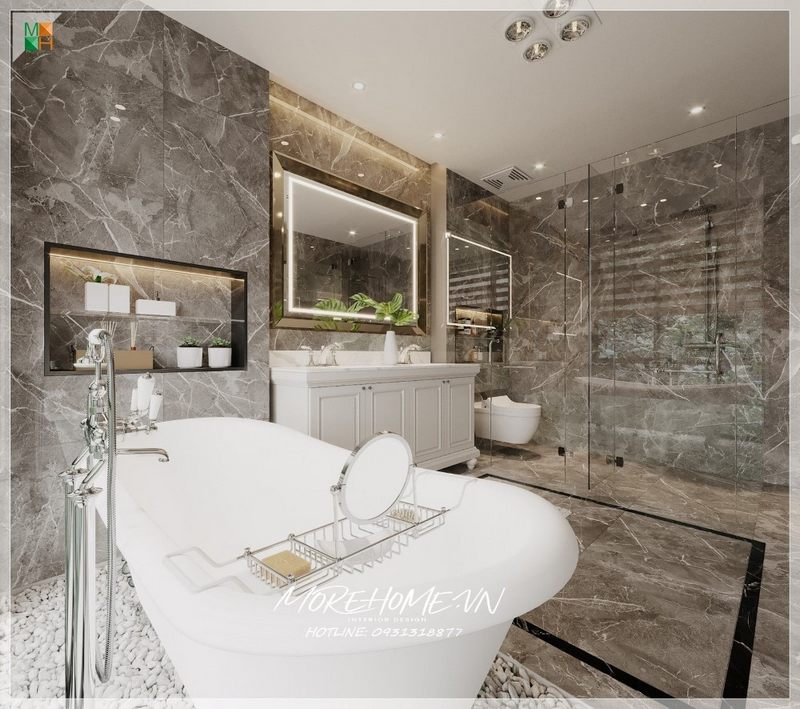 Phòng tắm master có bồn tắm, với tường và sàn sử dụng đá ốp nhân tạo màu xám vân mây cao cấp, vừa thẩm mỹ vừa đảm bảo sức khỏe cho người sử dụng