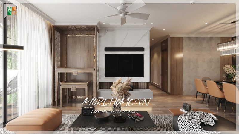 Bố trí nội thất phòng khách chung cư hiện đại được sắp xếp gọn gàng ngăn nắp và logic