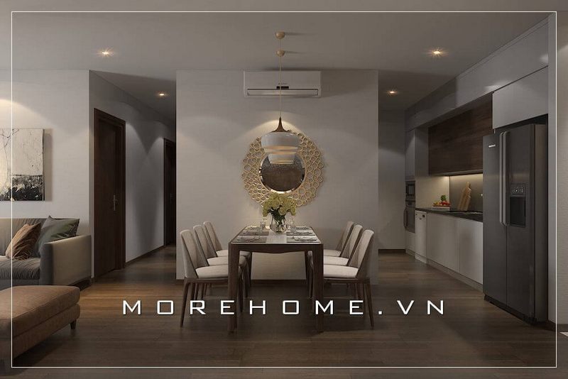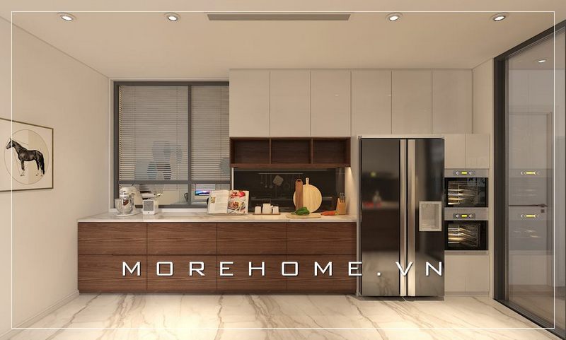 Thiết kế nội thất phòng bếp trong căn hộ hiện đại, đơn giản và tiện lợi.