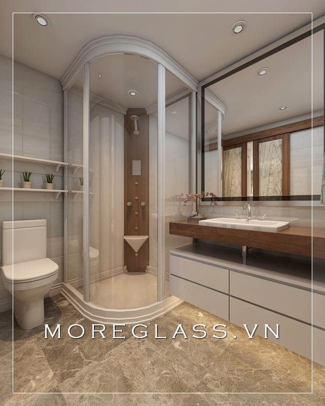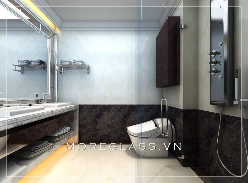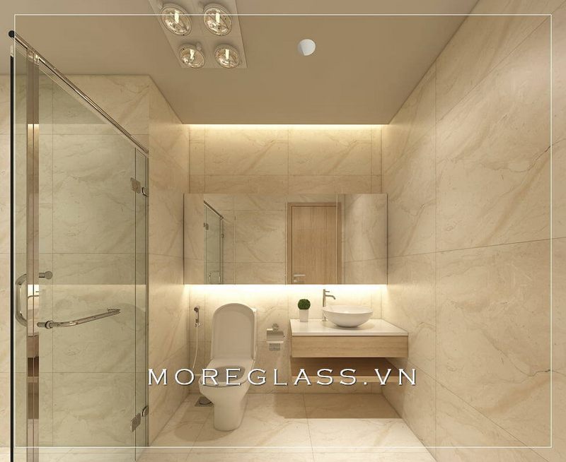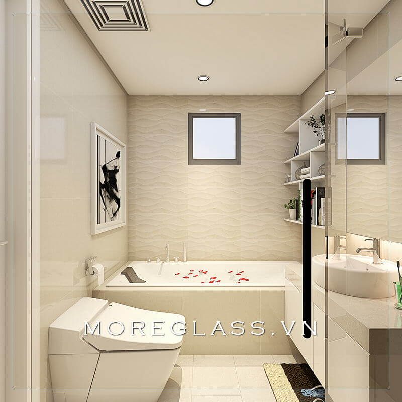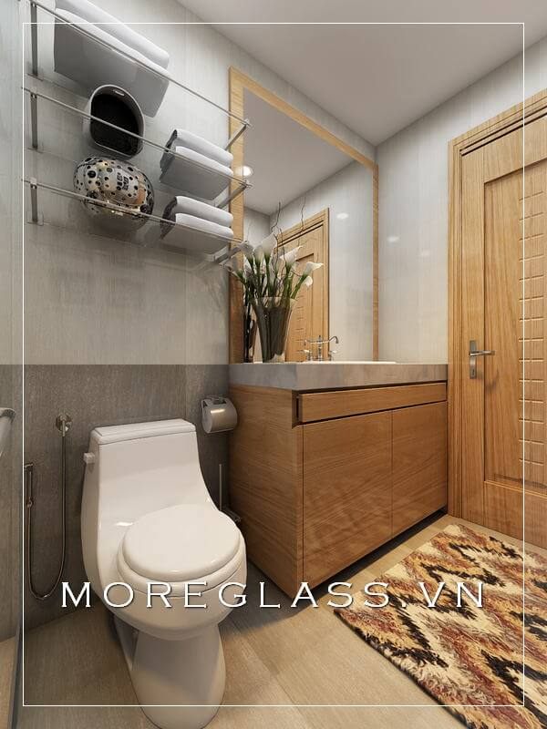 Mẫu nhà tắm và nhà vệ sinh hiện đại với phòng tắm kính cường lực cao cấp, nhỏ gọn giúp chia ra hai khu vực, mang lại cảm giác thoải mái cho căn phòng.