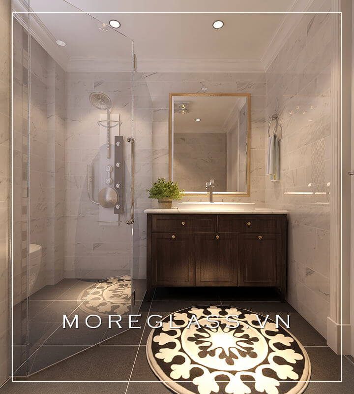 Gia chủ thích thiết kế phòng tắm sang trọng bằng cách sử dụng vách tắm kính kết hợp với đồ nội thất và các thiết bị vệ sinh hiện đại.