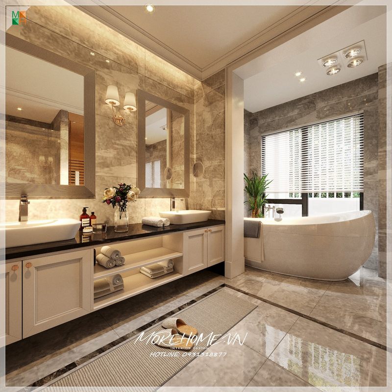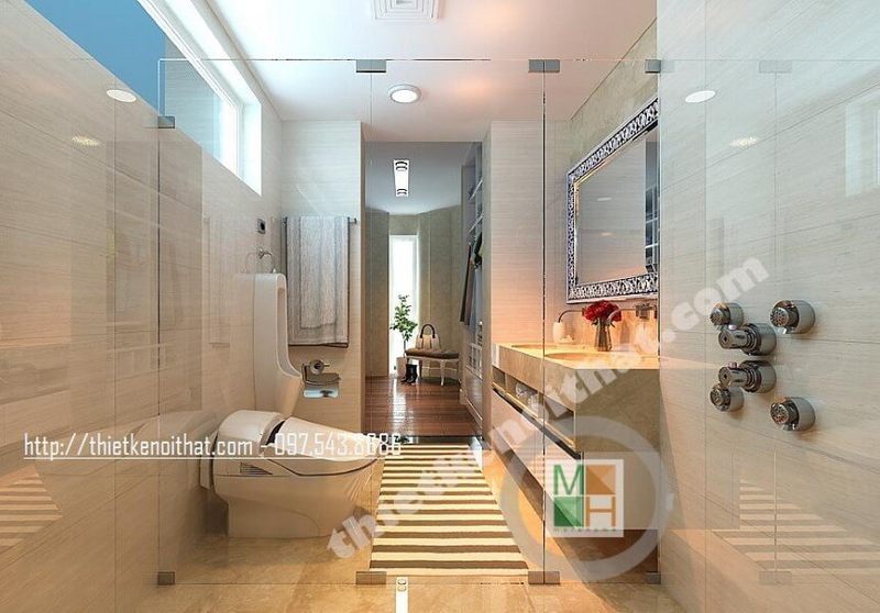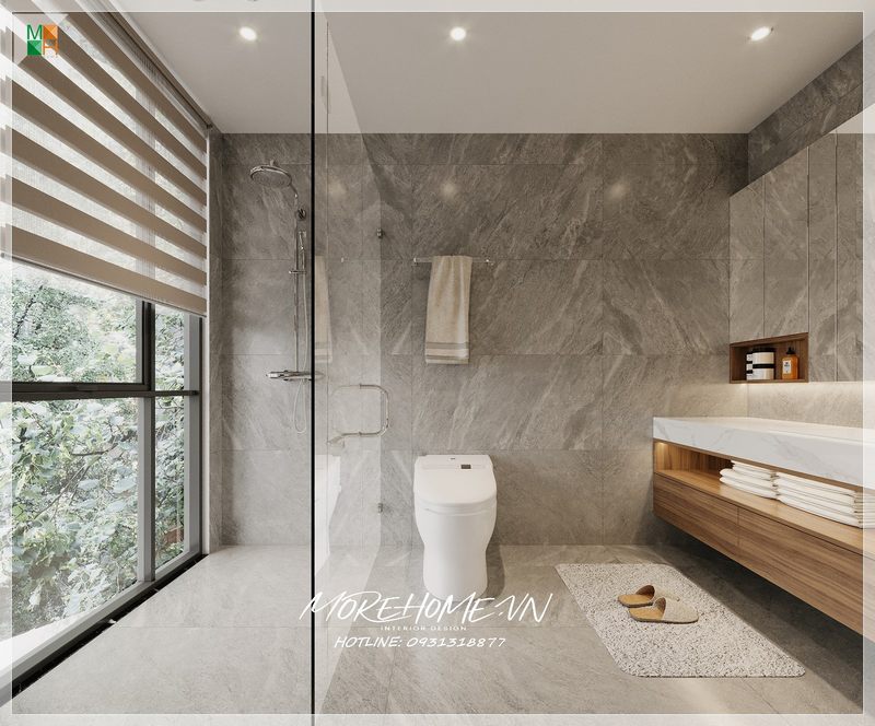 Phòng tắm hiện đại được trang bị nội thất bằng các vật liệu từ đá và kính giúp tạo nên một không gian thoáng mát và rộng rãi.