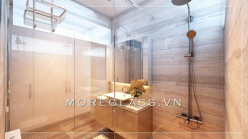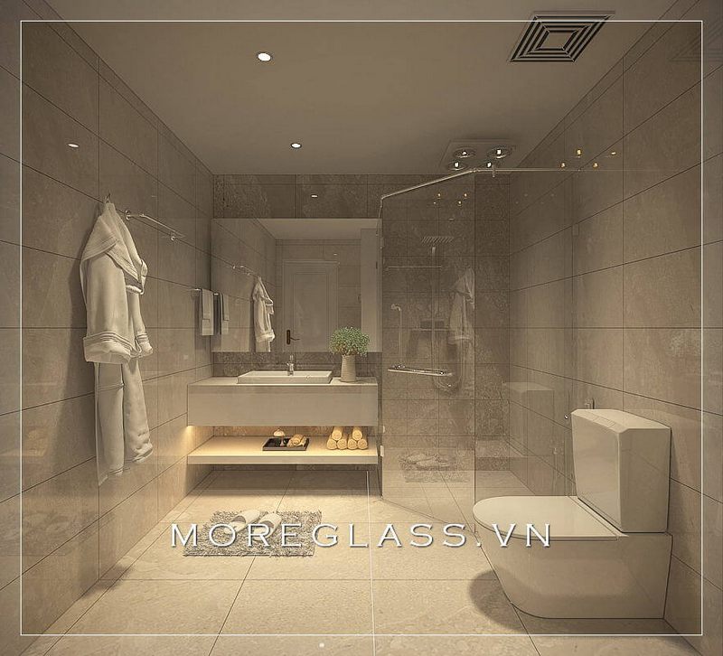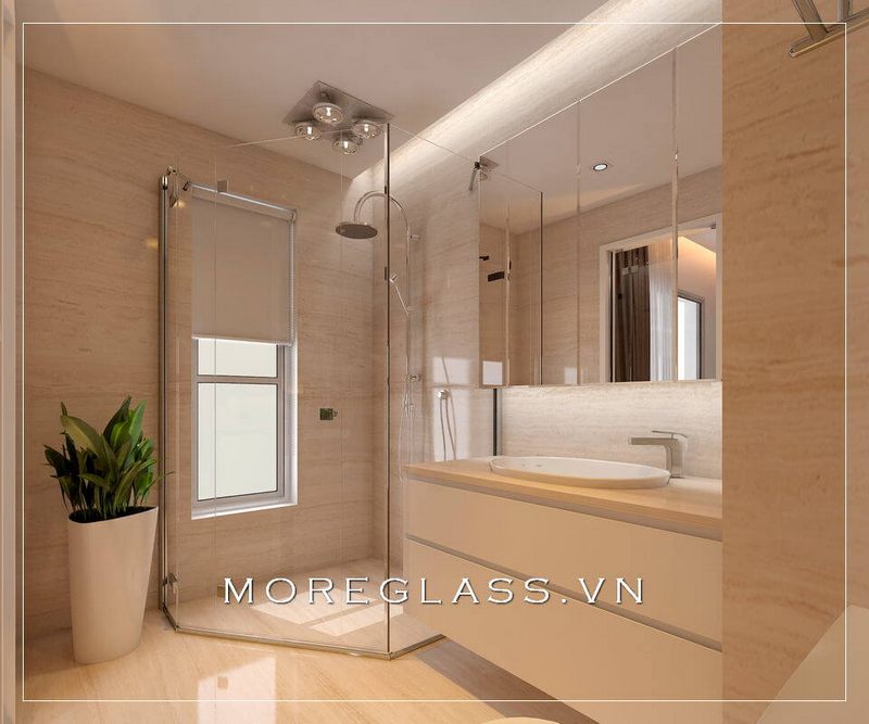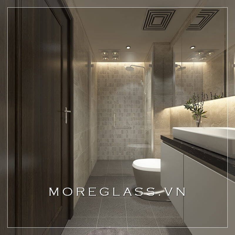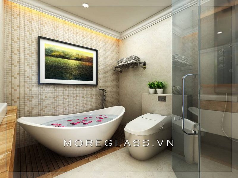 Mẫu thiết kế nhà tắm đẹp, nổi bật với vách kính đứng hiện đại giúp tách biệt hai không gian căn phòng và phòng tắm.