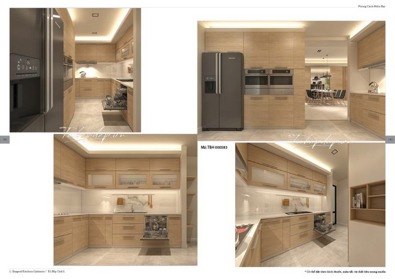 Tủ bếp có thiết kế hình chữ L tối ưu diện tích, phù hợp với các căn hộ, biệt thự, nhà phố, với tone màu nâu sáng vàng của gỗ làm chủ đạo.